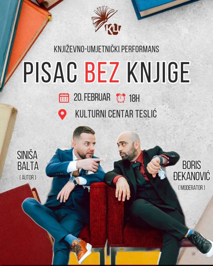 U svojevrsnom književnom performansu razgovor će voditi moderator Boris Đekanović i autor Siniša Balta iz Gradiške.