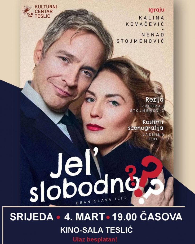 На сцени кино-сале заиграће романтична комедија „Јел’ слободно?“ — духовита и животна прича о сусретима, неспоразумима, мушко-женским односима и оним малим тренуцима који мијењају све.
