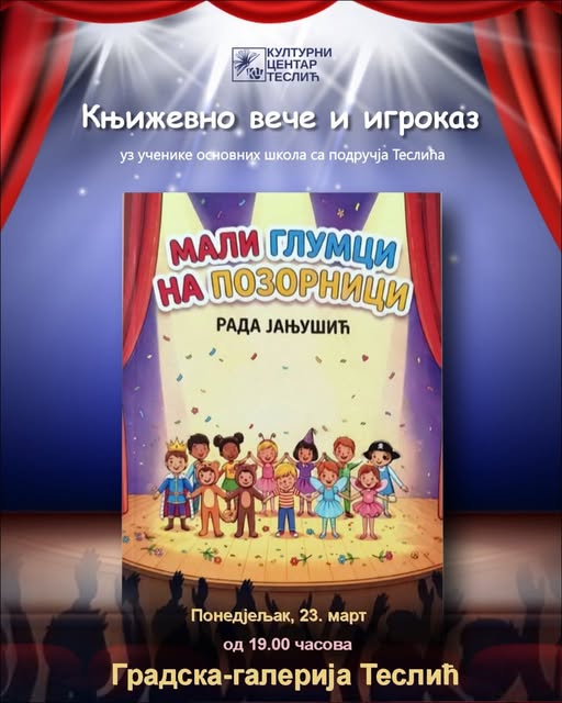 Kulturni centar Teslić poziva vas na književno veče i igrokaz „Mali glumci na pozornici“, inspirisan knjigom Rade Janjušić, u izvođenju učenika osnovnih škola sa područja Teslića. U igrokazima će učestvovati učenici OŠ ,, Vuk Karacić” – Teslić, Memić Brdo i Vitkovci, koje su pripremale učiteljice: Slavojka Kokić, Slava Stanojević, Željka Marković i Ljilja Miletić.