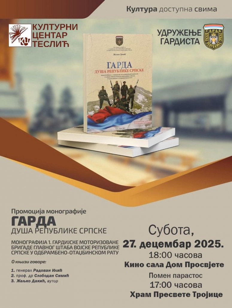Pozivamo vas na promociju monografije „Garda“, duša Republike Srpske, koja će biti održana 27. decembra u 18.00 časova, u kino-sali Doma prosvjete.