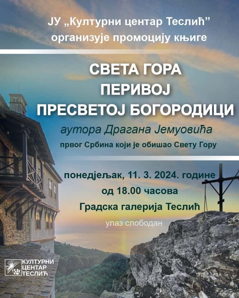 Dragi Teslićani, pozivamo vas na promociju knjige „Sveta Gora, perivoj Presvete Bogorodice“, autora Dragana Jemuovića. U knjizi su prikazani: istorija, geografija, topografija, organizacija Svete Gore, priče o monasima i njihovom načinu življenja. Opisana je arhitektura manastira i skitova, pomenute su: kelije i isposnice, značajna predanja, ikone i mošti. Istraživanjem je otvorio bezbroj pitanja o stvaranju i razvijanju srpske srednjovjekovne kulture i istorije pod uicajem Vizantije. Neke odgovore je pronašao, mnoge još uvijek traži, a bezbroj će čekati bolja vremena da izađu na svjetlo dana iz monaških tajni, manastirskih riznica i depoa. Promocija će se održati 11. marta 2024. godine u Gradskoj galeriji, sa početkom od 18.00 č. Očekujemo vas!