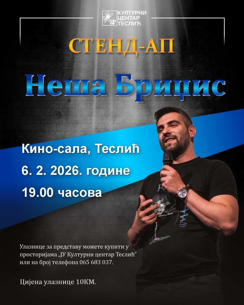 Драги наши суграђани, спремите се за много смијеха, јер један од најпопуларнијих стенд-ап комичара Неша Бриџис, долази и у наш град. Не пропустите овог сјајног мајстора имитације и импровизације 6. фебруара у Кино-сали, Теслић од 19.00 часова. Улазнице по цијени 10 КМ могу се купити радним данима од 08.00 до 15.00 ч. у просторијама ЈУ ,,Културни центар Теслић“ (канцеларија изнад Завода за запошљавање), или на бројеве телефона: 065657882 и 065683037