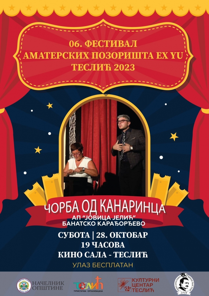 Поводом Фестивала аматерских позоришта „Екс-Ју“, у Теслићу наступа Аматерско позориште „Јовица Јелић“ из Банатског Карађорђева са представом „Чорба од канаринца“.