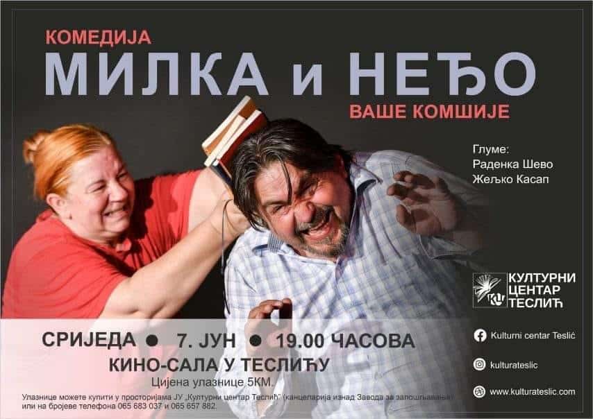 Nasmijte se uz poznate glumce Radenku i Željka u ulogama Milke i Neđe iz popularne serije „Dobro jutro, komšija“. Cijena ulaznice je 5 KM, a možete je kupiti u prostorijama JU „Kulturni centar Teslić“ (kancelarija iznad Zavoda za zapošljenje) ili rezervisati na brojeve telefona: 065683037 i 065657882.